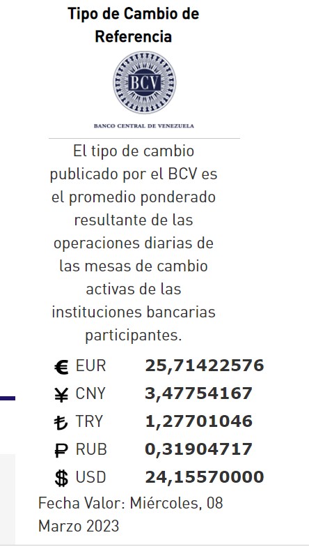 07-03-23.-El precio del dólar en el Banco Central de Venezuela (BCV) bajó legeramente y se cotizó este martes 07 de marzo 2023 en Bs. 24,15 por unidad según la última actualización en su página web oficial y redes oficiales.