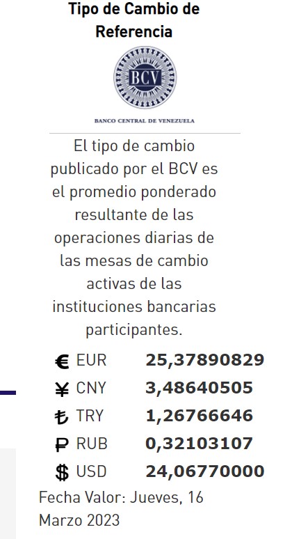 16-02-23.-El precio del dólar en el Banco Central de Venezuela (BCV) se se mantuvo estable este 15 de marzo 2023 y se cotizó Bs. 24,06 por unidad según la última actualización en su página web oficial y redes oficiales.