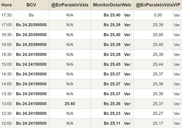 Por otro lado, el dólar paralelo en diversas plataformas se mantuvo estable en la jornada de hoy y cerró en un promedio de Bs.25,40 la unidad, según Monitor-DólarVenezuela.