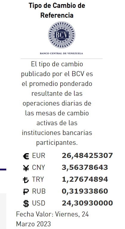 23-02-23.-El precio del dólar en el Banco Central de Venezuela (BCV) se cotizó este jueves 23 de marzo 2023 en Bs. 24,30 por unidad según la última actualización en su página web oficial y redes oficiales.