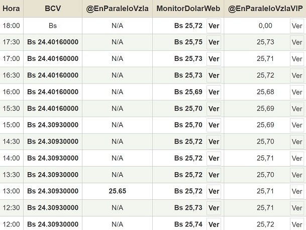 Por otro lado, el dólar paralelo en diversas plataformas subió ligeramente en la jornada de hoy y cerró en un promedio de Bs.25,72 la unidad, según Monitor-DólarVenezuela.