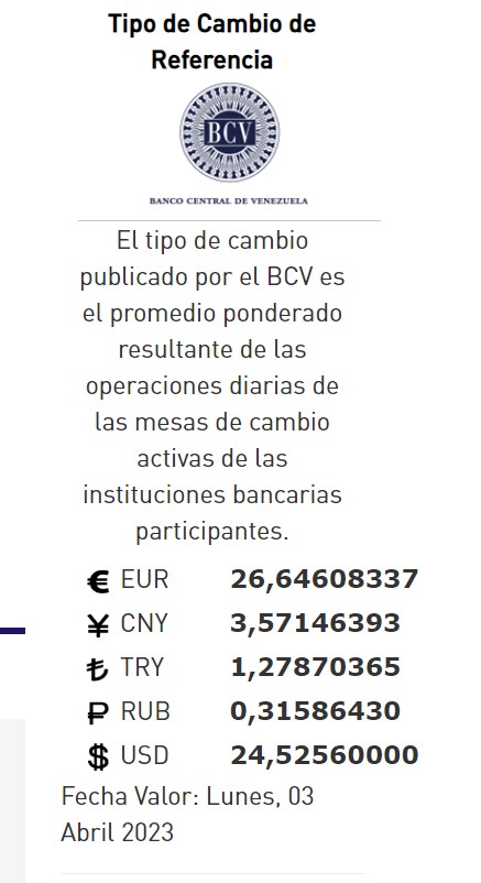 01-04-23.-El precio del dólar en el Banco Central de Venezuela (BCV) se cotizó este viernes 31 de marzo 2023 en Bs. 24,52 por unidad según la última actualización en su página web oficial y redes oficiales.