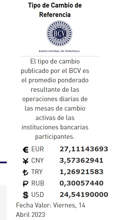 14-04-23.-El precio del dólar en el Banco Central de Venezuela (BCV) se cotizó este jueves de abril 2023 en Bs. 24,54 por unidad según la última actualización en su página web oficial y redes oficiales.
