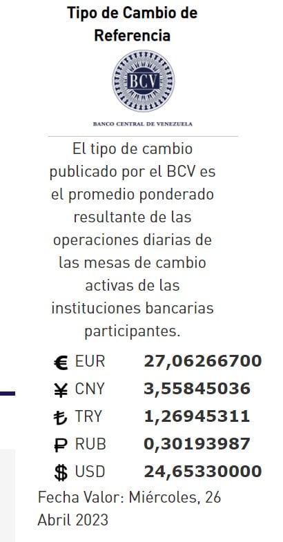 26-04-23.-El precio del dólar en el Banco Central de Venezuela (BCV) se cotizó este martes 25 de abril 2023 en Bs. 24,65 por unidad según la última actualización en su página web oficial y redes oficiales.