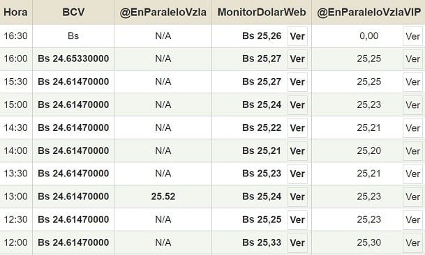 Por otro lado, el dólar paralelo en diversas plataformas en la jornada de hoy cerró en un promedio de Bs.25,26 la unidad, según Monitor-DólarVenezuela.