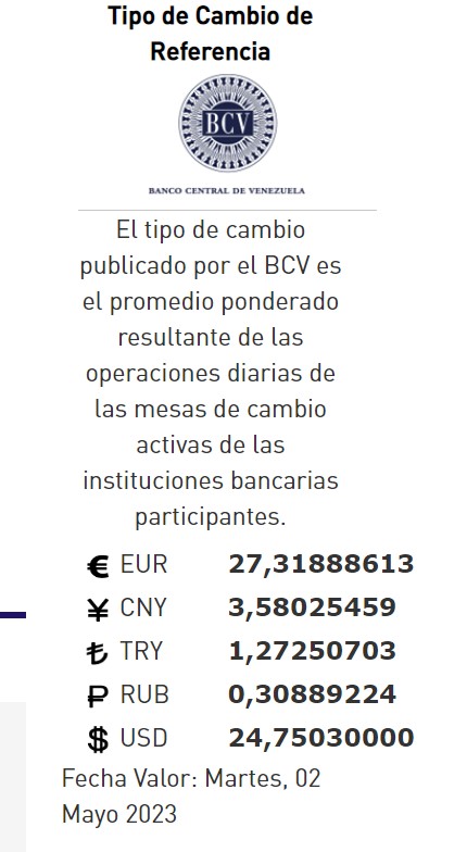 02-05-23.-El precio del dólar en el Banco Central de Venezuela (BCV) se cotizó este lunes 01 de mayo 2023 en Bs. 24,75 por unidad según la última actualización en su página web oficial y redes oficiales.