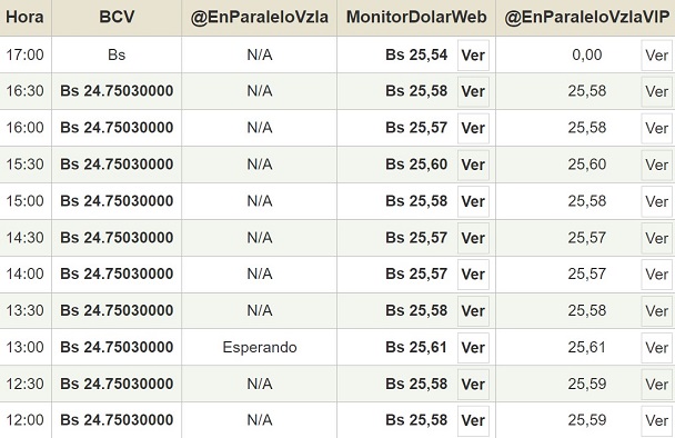 Por otro lado, el dólar paralelo en diversas plataformas en la jornada de hoy cerró en un promedio de Bs.25,54 la unidad, según Monitor-DólarVenezuela.