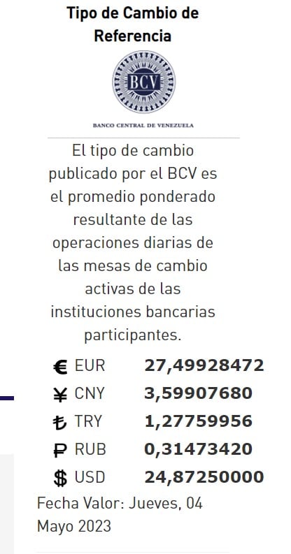 04-05-23.-El precio del dólar en el Banco Central de Venezuela (BCV) se cotizó este miércoles 03 de maio 2023 en Bs. 24,87 por unidad según la última actualización en su página web oficial y redes oficiales.