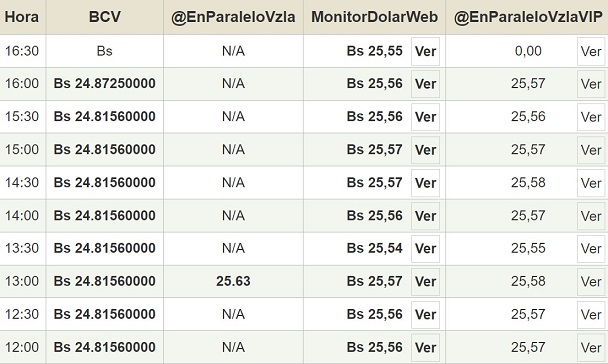 Por otro lado, el dólar paralelo en diversas plataformas en la jornada de hoy cerró en un promedio de Bs.25,55 la unidad, según Monitor-DólarVenezuela.