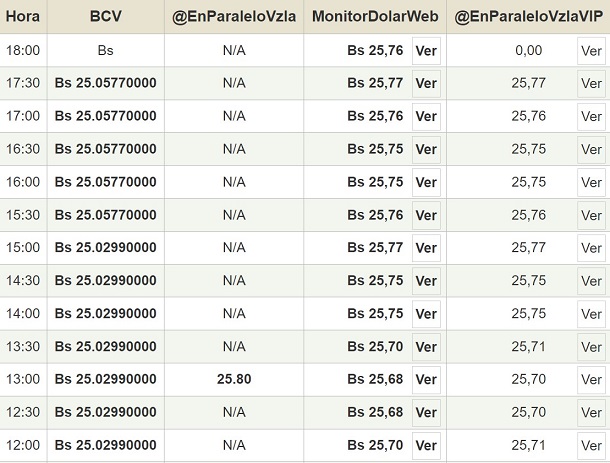Por otro lado, el dólar paralelo en diversas plataformas en la jornada de hoy cerró en un promedio de Bs.25,76 la unidad, según Monitor-DólarVenezuela.