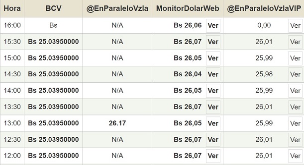 Por otro lado, el dólar paralelo en diversas plataformas en la jornada de hoy cerró en un promedio de Bs.25,03 la unidad, según Monitor-DólarVenezuela.