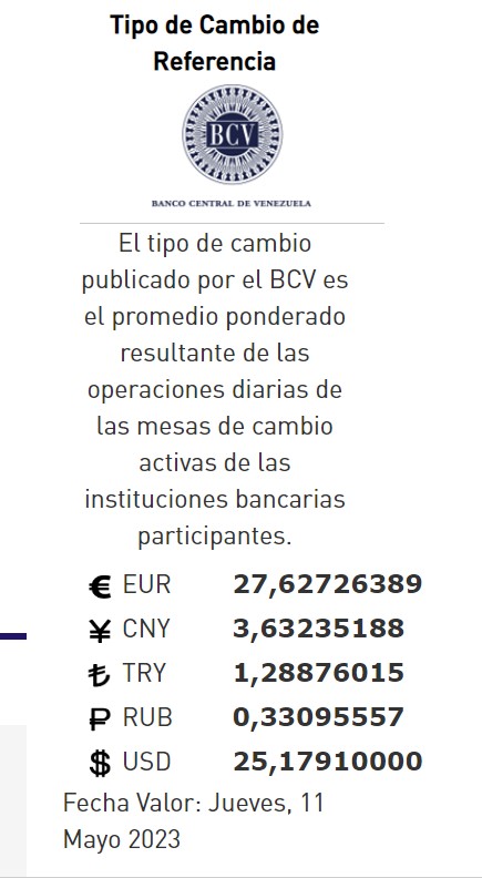 11-05-23.-El precio del dólar en el Banco Central de Venezuela (BCV)se cotizó este miércoles 10 de mayo 2023 en Bs. 25,17 por unidad según la última actualización en su página web oficial y redes oficiales.