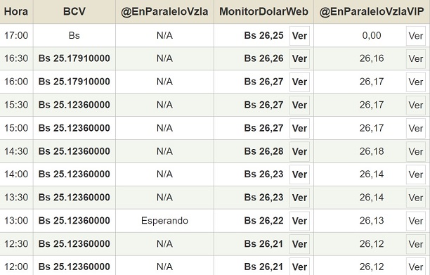Por otro lado, el dólar paralelo en diversas plataformas en la jornada de hoy cerró en un promedio de Bs.26,25 la unidad, según Monitor-DólarVenezuela.