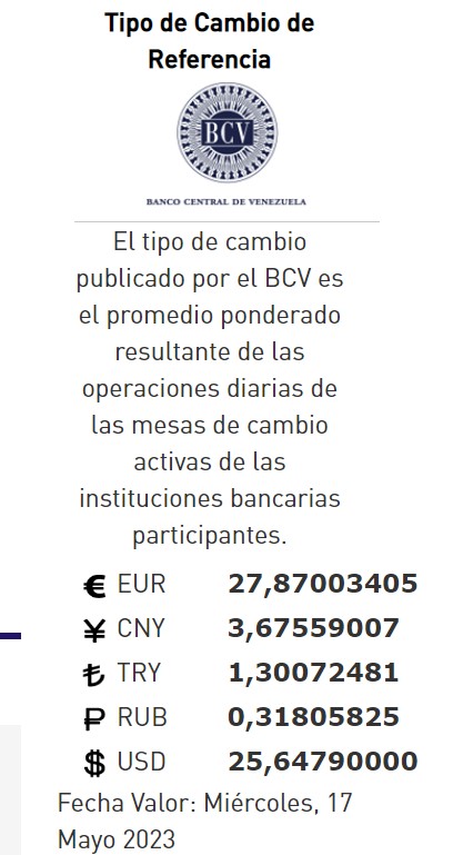 17-05-23.-El precio del dólar en el Banco Central de Venezuela (BCV)se cotizó este martes de mayo 2023  en Bs. 25,64 por unidad según la última actualización en su página web oficial y redes oficiales.