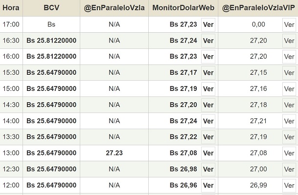 Por otro lado, el dólar paralelo en diversas plataformas en la jornada de hoy cerró en un promedio de Bs.27,23 la unidad, según Monitor-DólarVenezuela.