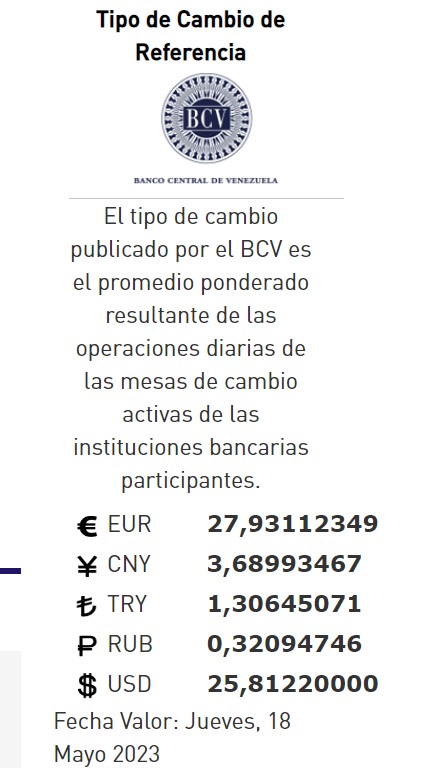 18-05-23.-El precio del dólar en el Banco Central de Venezuela (BCV)se cotizó este miércoles 17 de mayo 2023  en Bs. 25,81 por unidad según la última actualización en su página web oficial y redes oficiales.