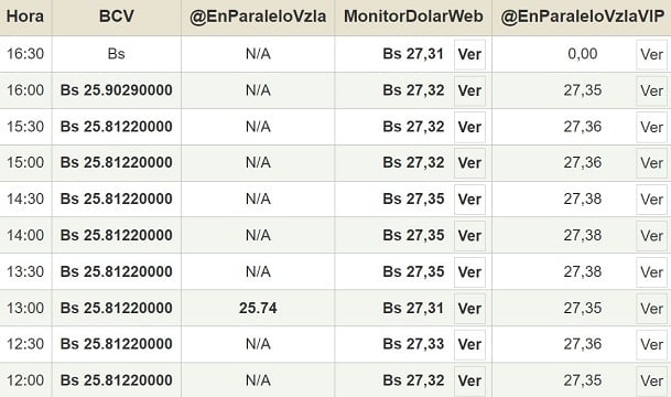 Por otro lado, el dólar paralelo en diversas plataformas en la jornada de hoy cerró en un promedio de Bs.27,31 la unidad, según Monitor-DólarVenezuela.