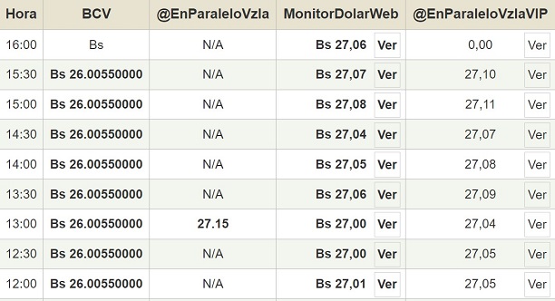Por otro lado, el dólar paralelo en diversas plataformas en la jornada de hoy cerró en un promedio de Bs.27,06 la unidad, según Monitor-DólarVenezuela.