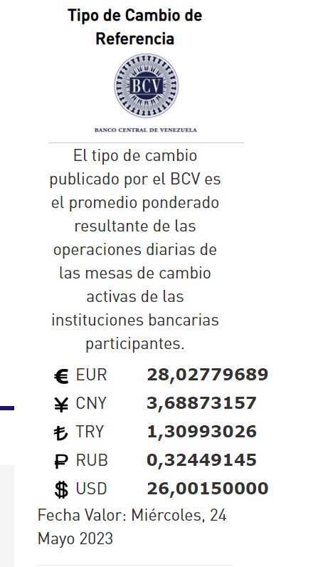 24-05-23.-El precio del dólar en el Banco Central de Venezuela (BCV)se cotizó este lunes de mayo 2023 en Bs. 26,00 por unidad según la última actualización en su página web oficial y redes oficiales.