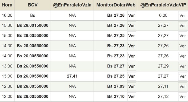 Por otro lado, el dólar paralelo en diversas plataformas en la jornada de hoy cerró en un promedio de Bs.27,26 la unidad, según Monitor-DólarVenezuela.