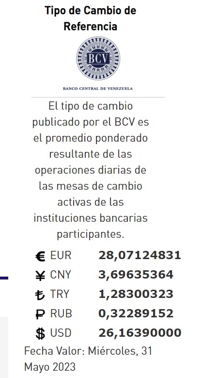 31-05-23.-El precio del dólar en el Banco Central de Venezuela (BCV)se cotizó este martes 30 de mayo 2023  en Bs. 26,16 por unidad según la última actualización en su página web oficial y redes oficiales.