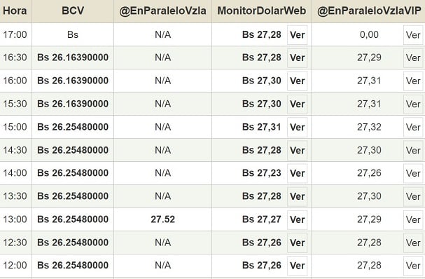 Por otro lado, el dólar paralelo en diversas plataformas en la jornada de hoy cerró en un promedio de Bs.27,28 la unidad, según Monitor-DólarVenezuela.