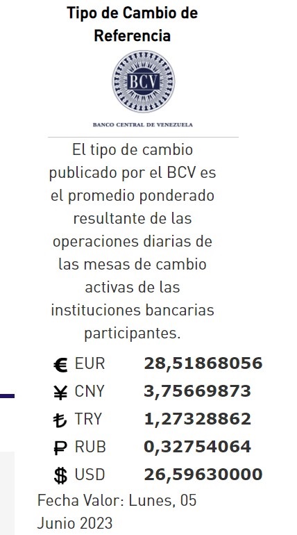 03-06-23.-El precio del dólar en el Banco Central de Venezuela (BCV)se cotizó este viernes 02 de junio 2023 en Bs. 26,59 por unidad según la última actualización en su página web oficial y redes oficiales.