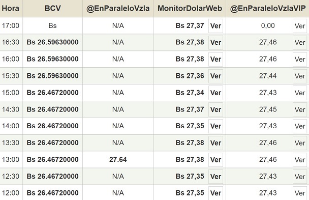 Por otro lado, el dólar paralelo en diversas plataformas en la jornada de hoy cerró en un promedio de Bs.27,37 la unidad, según Monitor-DólarVenezuela.