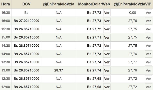 Por otro lado, el dólar paralelo en diversas plataformas en la jornada de hoy cerró en un promedio de Bs.27,61 la unidad, según Monitor-DólarVenezuela.