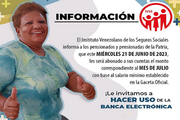 El Gobierno Nacional, mediante el Instituto Venezolano de los Seguros Sociales (IVSS), informó que este martes 20 de junio les fue abonado el monto correspondiente del mes de julio del 2.023.