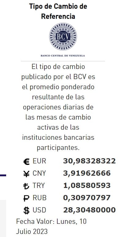 08-07-23.-23.-El precio del dólar en el Banco Central de Venezuela (BCV)se cotizó este viernes 07 de julio 2023 en Bs. 28,30 por unidad según la última actualización en su página web oficial y redes oficiales.