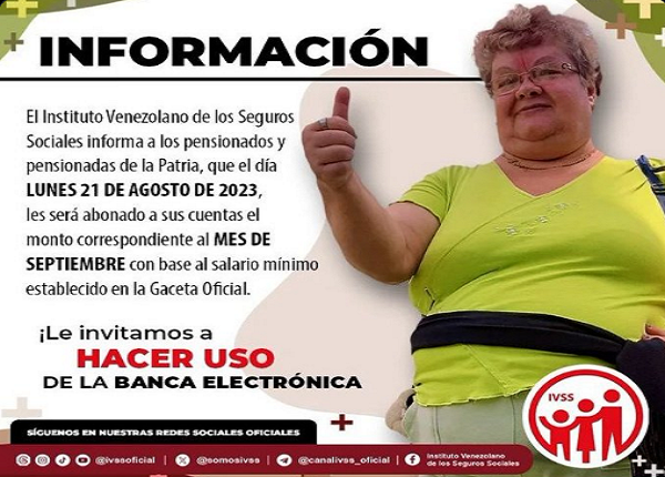 El Gobierno Nacional, mediante el Instituto Venezolano de los Seguros Sociales (IVSS), informó que este domingo 20 de agosto les fue abonado el monto correspondiente del mes de septiembre del 2.023.