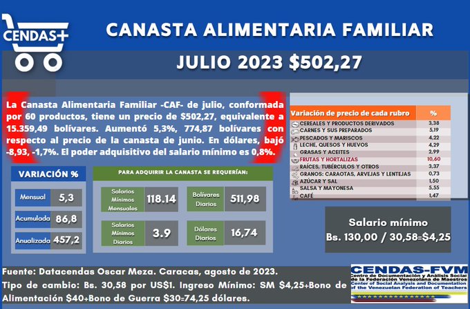 22-98-23.-Una familia venezolana de cinco personas necesita 118,14 salarios mínimos para acceder a la canasta alimentaria familiar, cuyo valor en julio fue de 502,27 dólares, según estimaciones difundidas este lunes por el Centro de Documentación y Análisis Social de la Federación Venezolana de Maestros (Cendas-FVM).