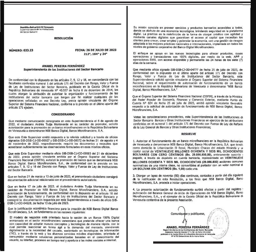 Se trata del "N58 Banco Digital, Banco Microfinanciero, S.A.", que autorizado por la Superintendencia de Instituciones del Sector Bancario (Sudeban), según Gaceta Oficial N° 42.693 con fecha del 16 de agosto, operará 100% de forma digital y tendrá su sede dentro del territorio nacional.