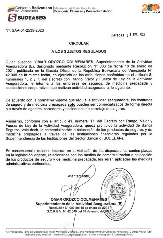 02-09-23.-Según circular Nº SAA-01-2539-2023 de fecha primero de septiembre de 2023, emitida por la Superintendencia de la Actividad Aseguradora (SUDEASEG), se señala que de acuerdo a la normativa vigente que regula la actividad aseguradora, los contratos de seguro y de medicina prepagada sólo pueden ser comercializados de forma directa o a través de agentes, corredores y sociedades de corretaje de seguros.