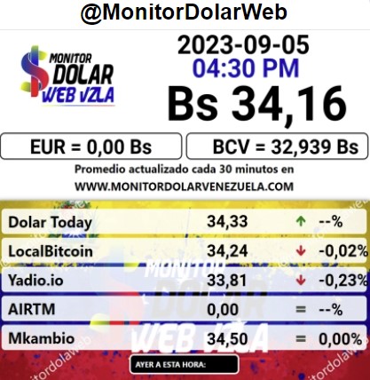 Por otro lado, el dólar paralelo en diversas plataformas en la jornada de hoy cerró en un promedio de Bs.33,88 la unidad, según Monitor-DólarVenezuela.