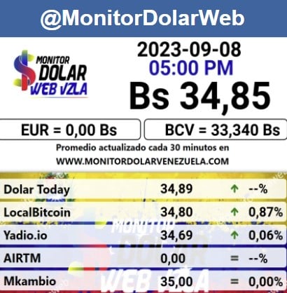 Por otro lado, el dólar paralelo en diversas plataformas en la jornada de hoy cerró en un promedio de Bs.34,85 la unidad, según Monitor-DólarVenezuela.