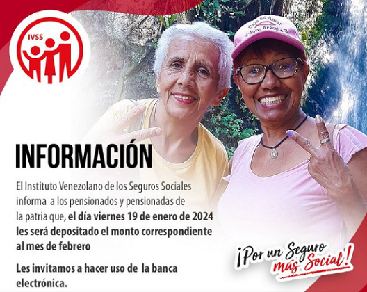 El Gobierno Nacional, mediante el Instituto Venezolano de los Seguros Sociales (IVSS), informó que hoy viernes 19 de enero fue será depositado el monto correspondiente del mes de febrero del 2024.
