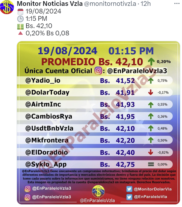 Por otro lado, el dólar paralelo en diversas plataformas en la jornada de hoy cerró en un promedio de Bs.42,10 la unidad, según Monitor Noticias Venezuela.