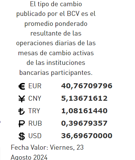 23-08-24.--08-24.-El precio del dólar en el Banco Central de Venezuela (BCV) se cotizó este jueves 22 de agosto 2024 en Bs. 36,69 por unidad según la última actualización en su página web oficial y redes sociales.