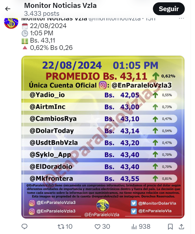Por otro lado, el dólar paralelo en diversas plataformas en la jornada de hoy cerró en un promedio de Bs.39, la unidad, según Monitor-Noticias Venezuela.