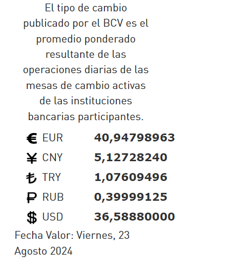 24-08-24.-El precio del dólar en el Banco Central de Venezuela (BCV) se cotizó este viernes 24 de agosto 2024 en Bs. 36,58 por unidad según la última actualización en su página web oficial y redes sociales. https://www.bcv.org.ve/