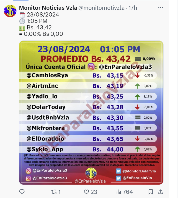 Por otro lado, el dólar paralelo en diversas plataformas en la jornada de hoy cerró en un promedio de Bs.43,42 la unidad, según Monitor-Noticias Venezuela.