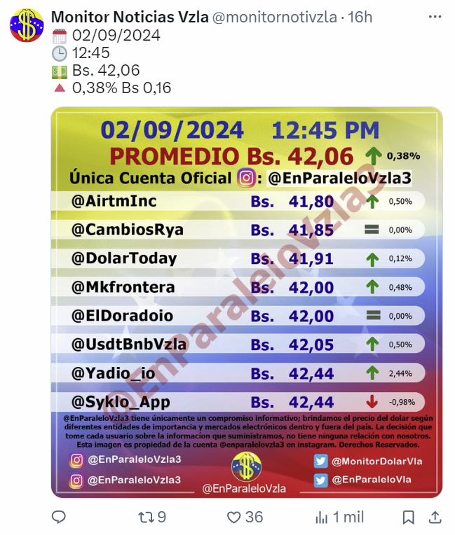 Por otro lado, el dólar paralelo en diversas plataformas en la jornada de hoy cerró en un promedio de Bs.42,06 la unidad, según Monitor-Noticias Venezuela.