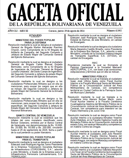 05-09-24.-En Gaceta Oficial Nº 42.952, de fecha 29 de agosto de 2024, fue publicada una resolución mediante la cual, se establece que los billetes del "Bolívar Soberano", con denominaciones de Bs. 10.000, Bs. 20.000, Bs. 50.000 y Bs. 200.000 circularán hasta el 25 de septiembre de 2024, fecha a partir de la cual perderán su poder liberatorio.