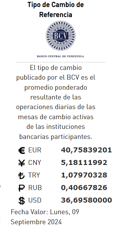 07-09-24.-El precio del dólar en el Banco Central de Venezuela (BCV) se cotizó este viernes 06 de septiembre 2024 en Bs. 36,60 por unidad según la última actualización en su página web oficial y redes sociales.