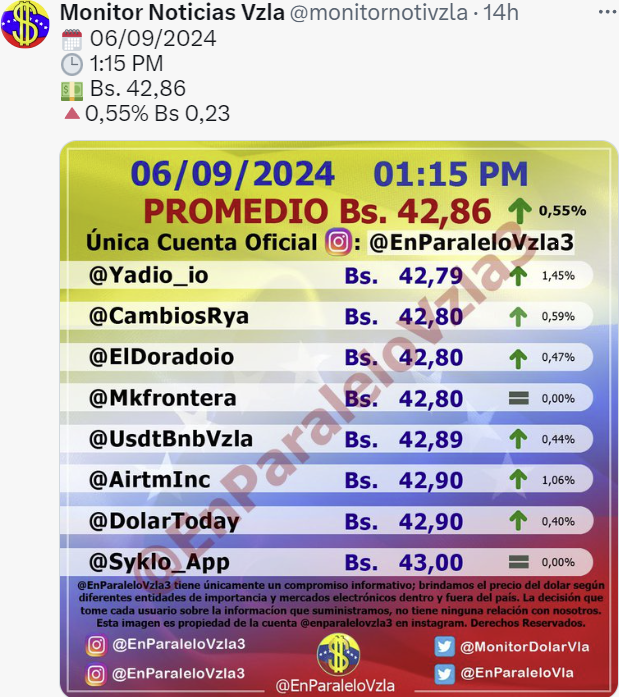 Por otro lado, el dólar paralelo en diversas plataformas en la jornada de hoy cerró en un promedio de Bs.42,86 la unidad, según Monitor-Noticias Venezuela.