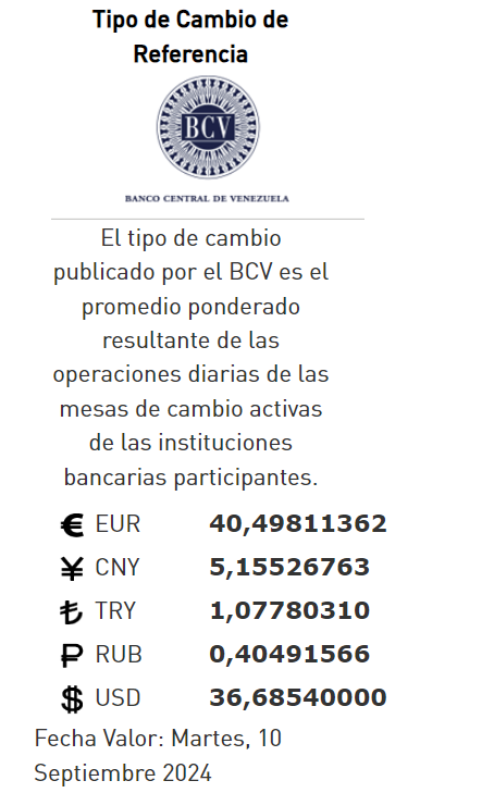 10-09-24.-09-24.-El precio del dólar en el Banco Central de Venezuela (BCV) se cotizó este lunes 09 de septiembre 2024 en Bs. 36,68 por unidad según la última actualización en su página web oficial y redes sociales.