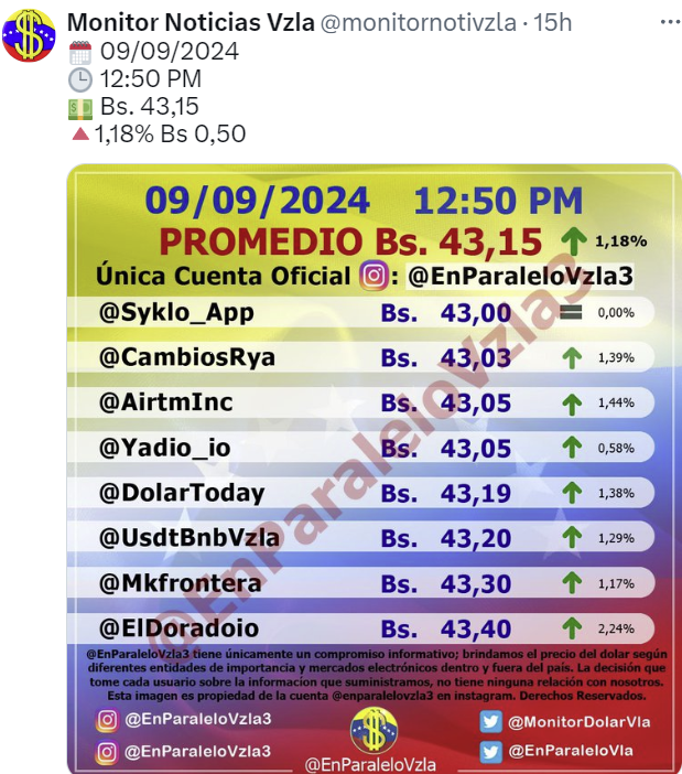 Por otro lado, el dólar paralelo en diversas plataformas en la jornada de hoy cerró en un promedio de Bs.43,15 la unidad, según Monitor-Noticias Venezuela.