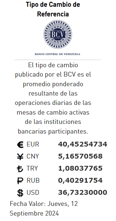 11-09-24.-El precio del dólar en el Banco Central de Venezuela (BCV) se cotizó este miércoles 11 de septiembre 2024 en Bs. 36,73 por unidad según la última actualización en su página web oficial y redes sociales.